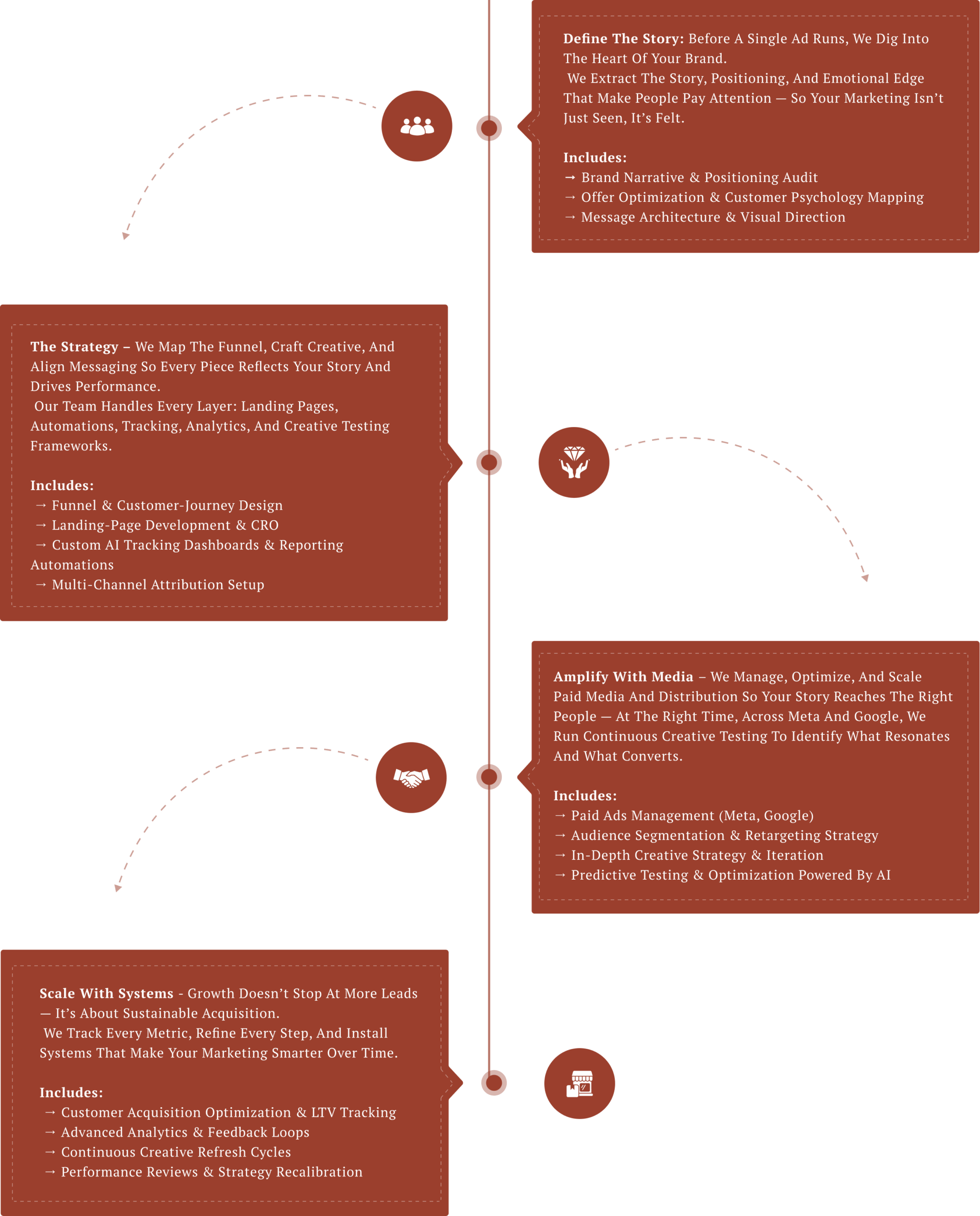 Our approach is full-funnel with your brand story cohesively guiding the entire process. From AI-driven creative strategy to offer and funnel optimization, client acquisition system, and paid ads management, we ensure your entire infrastructure is the best it can be to work for your business.